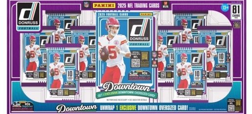 The 2025 Donruss Football bundle draws on a 400-card set including 300 Base and 100 Rated Rookies. Also keep an eye out for Autographs and Memorabilia cards from some of the league’s hottest players, look for the exclusive Optic Rated Rookie Preview Red Pandora parallel and unwrap one exclusive Downtown! oversized card.